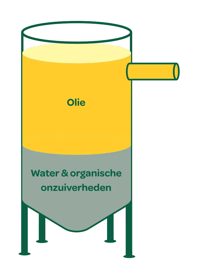 Het proces start met het zuiveren van de gebruikte frituurolie. Water, voedselresten en andere onzuiverheden worden verwijderd via filtering en decantering. Zo blijft enkel de zuivere olie over, klaar voor verdere verwerking tot feedstock voor biobrandstof.