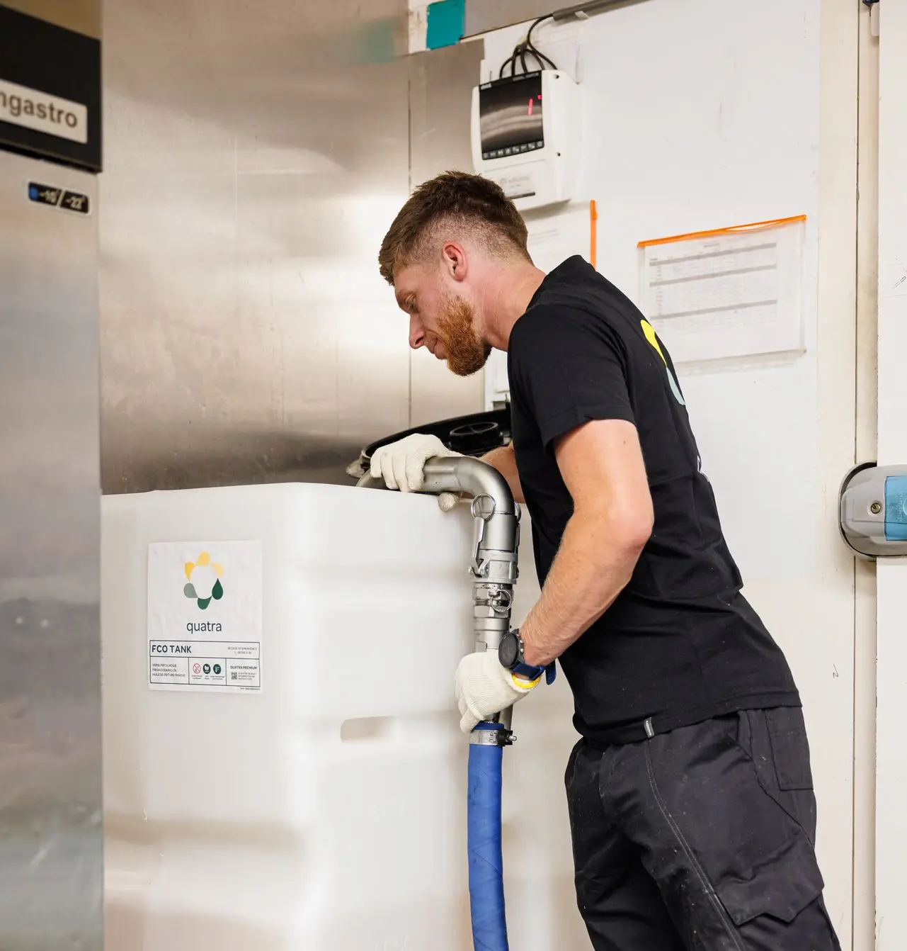 Onze chauffeur sluit de slang rechtstreeks aan op de bulktank in jouw keuken of opslagruimte. De frituurolie wordt veilig en hygiënisch bijgevuld, zonder morsen of verpakkingsafval. Alles verloopt vlot tijdens dezelfde route waarop ook je gebruikte olie wordt opgehaald.