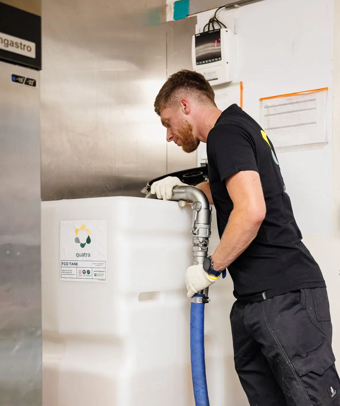 Onze chauffeur sluit de slang rechtstreeks aan op de bulktank in jouw keuken of opslagruimte. De frituurolie wordt veilig en hygiënisch bijgevuld, zonder morsen of verpakkingsafval. Alles verloopt vlot tijdens dezelfde route waarop ook je gebruikte olie wordt opgehaald.